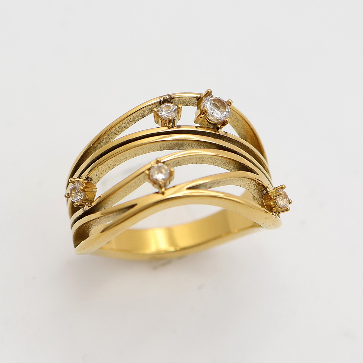 Ring KIONA is een elegante vergulde stalen ring met golvend design. De meerdere banen vormen samen een harmonieus geheel, subtiel versierd met fonkelende zirkonia’s.