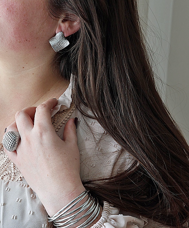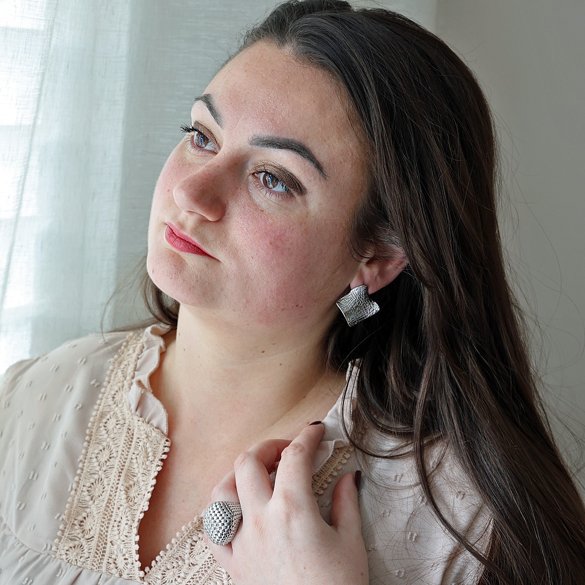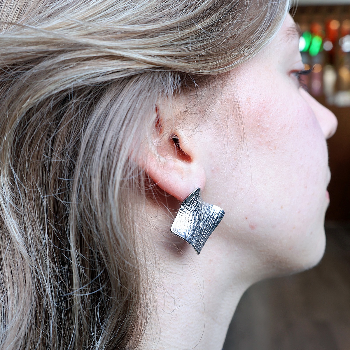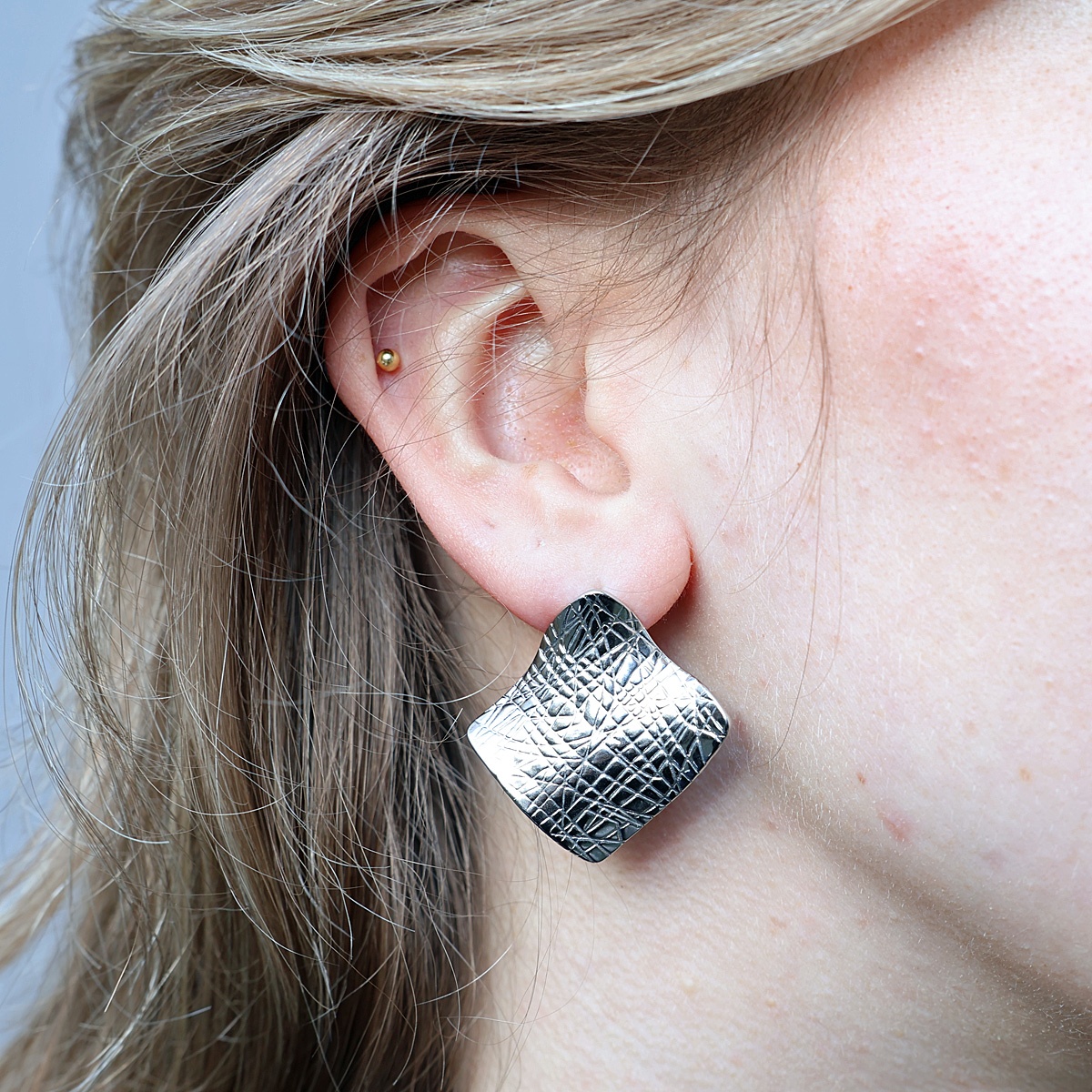 Golvende vierkante oorbellen van Mabiënte in speelse vorm en subtiel reliëf.