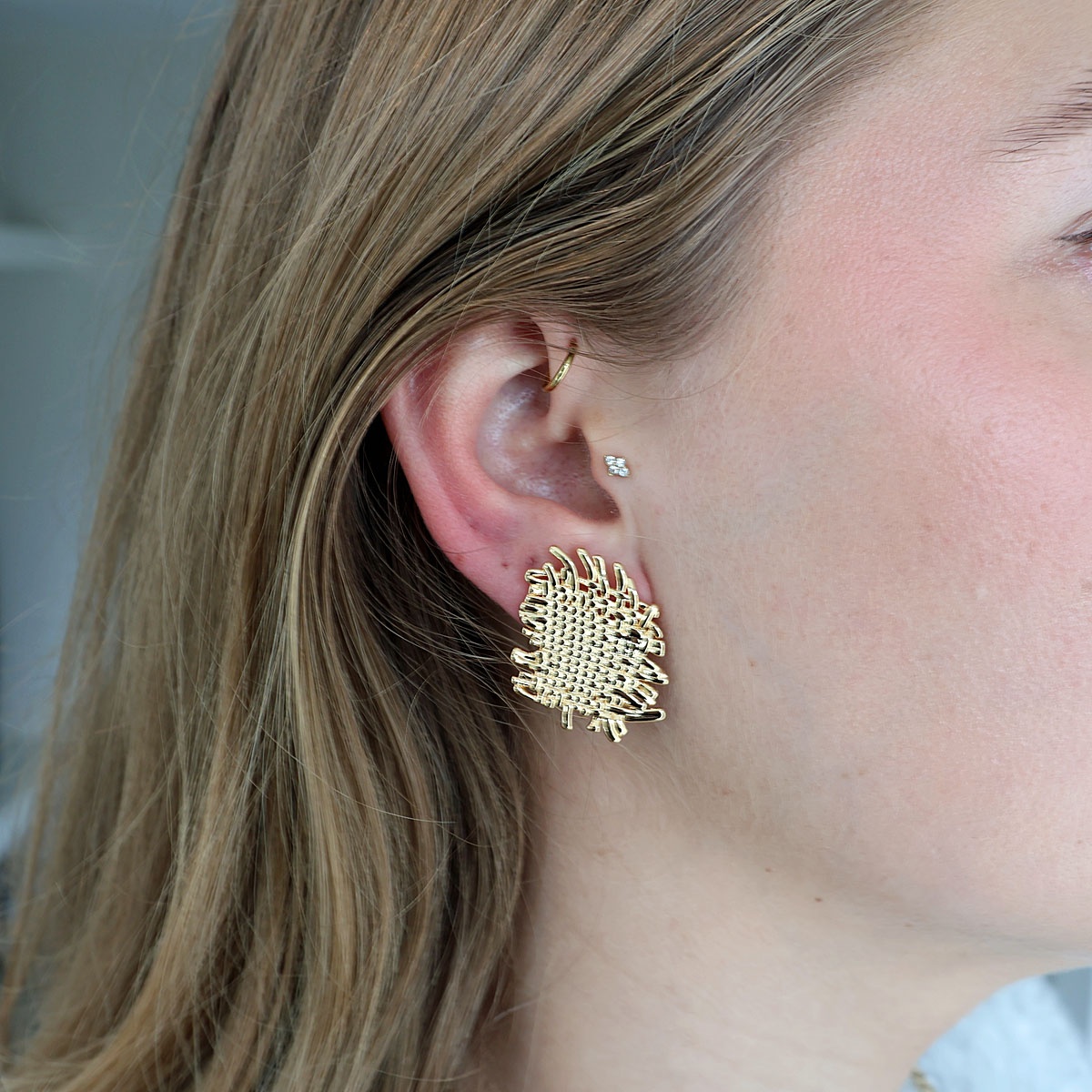 Deze bijzondere oorbellen van Mabiënte hebben een onregelmatige ruitvorm die doet denken aan grof geweven stof. Het vergulde messing geeft de speelse textuur een luxe glans, waardoor de oorbellen een kunstzinnige en moderne uitstraling krijgen.