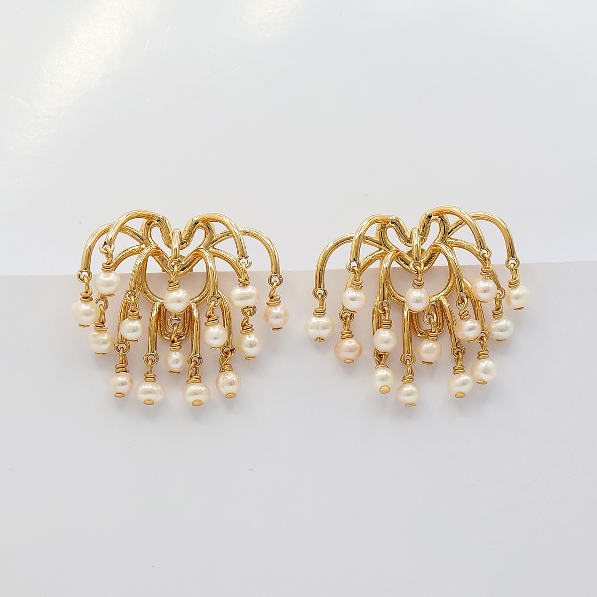 Deze goudkleurige statement oorbellen met pareltjes geven elke outfit direct een luxueuze en vrouwelijke uitstraling. De verfijnde parelhangers bewegen sierlijk mee, waardoor de oorbellen een speels en chique effect krijgen.